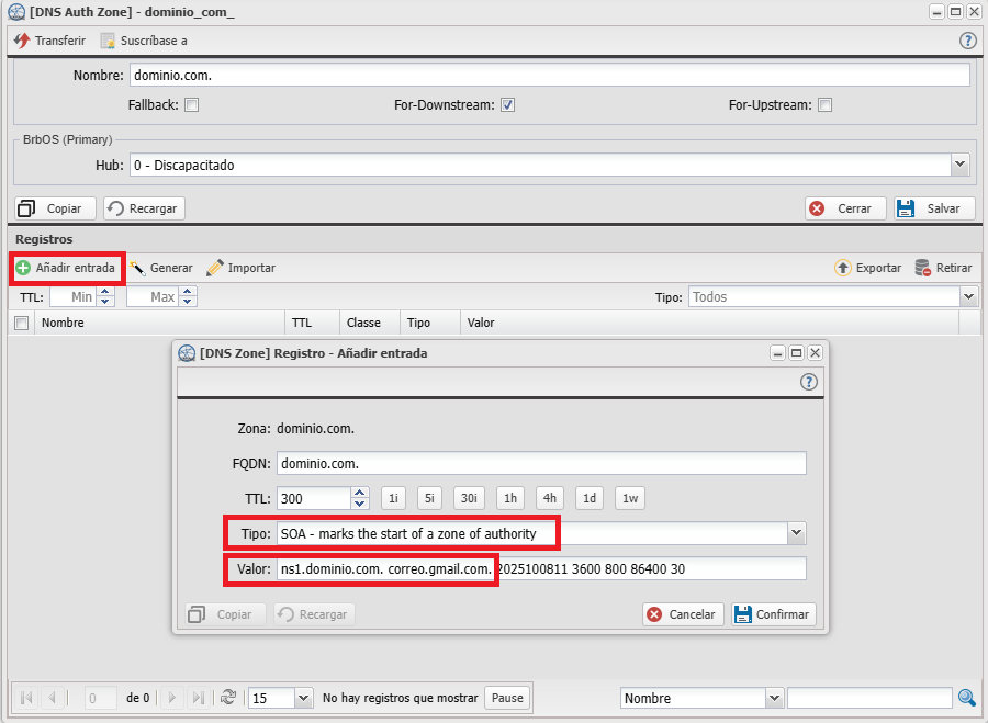 Completa los datos requeridos. En primer lugar, especifica el nombre del servidor primario que tendrá autoridad sobre el dominio (por ejemplo: ns1.dominio.com) y un correo electrónico válido (sustituyendo el carácter @ por un punto .). Los demás campos se generan automáticamente, por lo que no es necesario modificarlos.