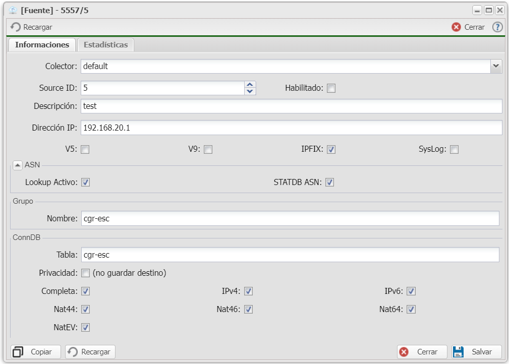 - v9/IPFIX Template Refresh: Número de paquetes tras el cual el modelo es enviado al host receptor (solo para NetFlow versión 9).