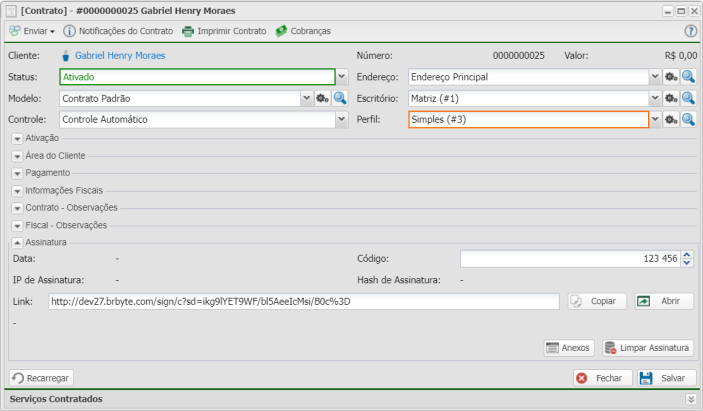 En esta zona tendrás acceso a la URL que deberás enviar a tu cliente para que pueda firmar este contrato. La URL solo aparecerá después de guardar el contrato, es decir, haber hecho clic en el botón Guardar. Para que esta sesión funcione correctamente, debe registrar las Direcciones del servidor (ubicadas en la aplicación Registro). Todos los campos de la imagen siguiente se describen en la siguiente tabla.