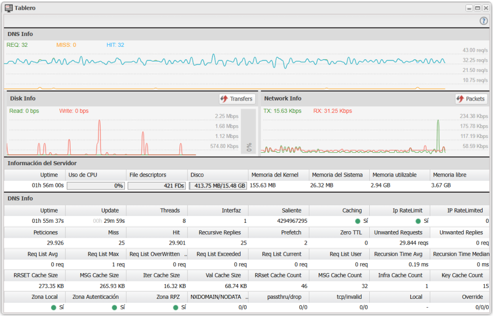 Esta sección muestra la información interna del funcionamiento DNS, agrupada por categoría.