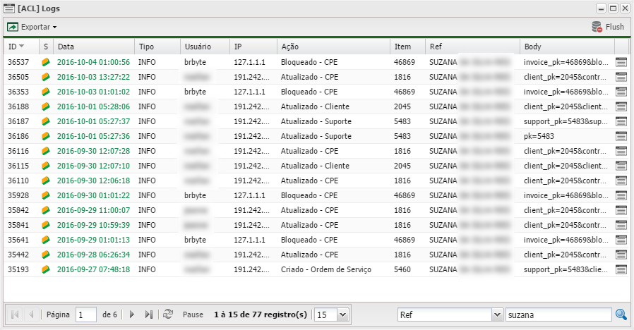 En la parte superior del panel se dispone de herramientas para filtrar, buscar y exportar registros.